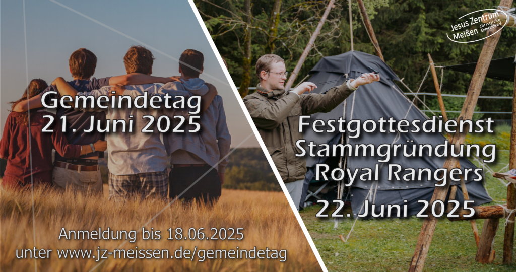 Gemeindetag / Festgottesdienst Stammgründung Royal Rangers Am 21.06.2025 findet uns Gemeindetag statt. Mehr Informationen und die Anmeldung findet ihr hier. Am 22.06.2025 feiern wir mit einem Festgottesdienst die Gründung unseres Royal Rangers Stamm.