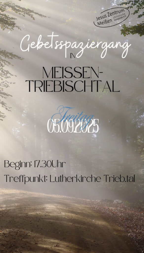 Am Freitag, den 05.09.2025, findet wieder ein Gebetsspaziergang im Meißen-Triebischtal statt. Los geht es 17.30 Uhr am der Lutherkirche im Triebischtal.