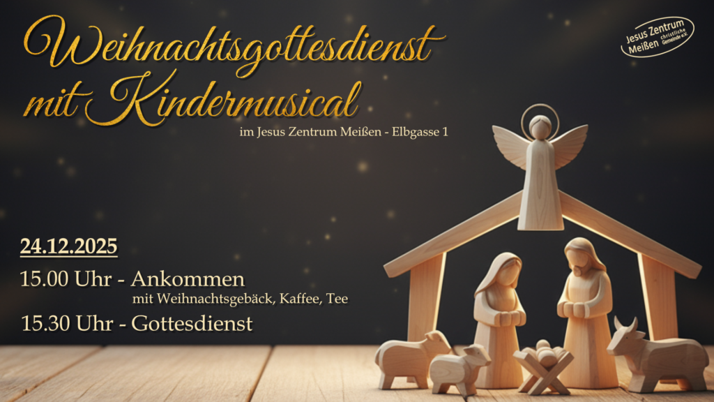 Weihnachtsgottesdienst mit Kindermusical Am Mittwoch, den 24.12.2025, findet bei uns ein Weihnachtsgottesdienst mit Kindermusical statt. Los geht es 15.30 Uhr, aber Ihr seid bereits ab 15 Uhr zu Kaffee/ Tee/ Gebäck und guten Gesprächen eingeladen!