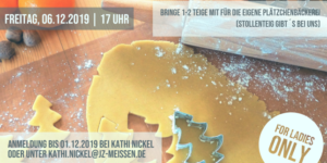 Plätzchen und Stollen backen, Kaffeetrinken, gute Gespräche… Freitag, den 06.12.2019 findet im Jesus Zentrum Meißen ein weiteres „For Ladies only“ Event statt. Bringt bitte 1-2 Teige für die eigenen Plätzchen …